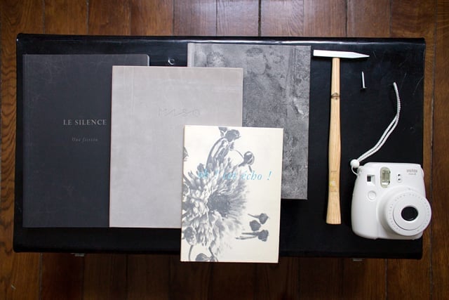 Livres En route de Huysmans et La Mort volontaire au Japon de Maurice Pinguet, Lunettes Moscot, Montre Hermès, Bagues Corpus Christi, Parfum Bel Ami d'Hermès, Portefeuille Repop MFG, Carnet création personnelle de CamilleArmoire vintage Ana color industrie