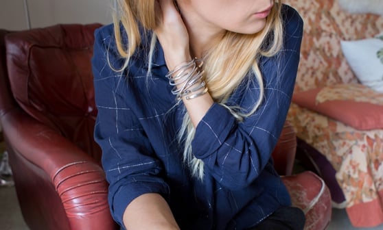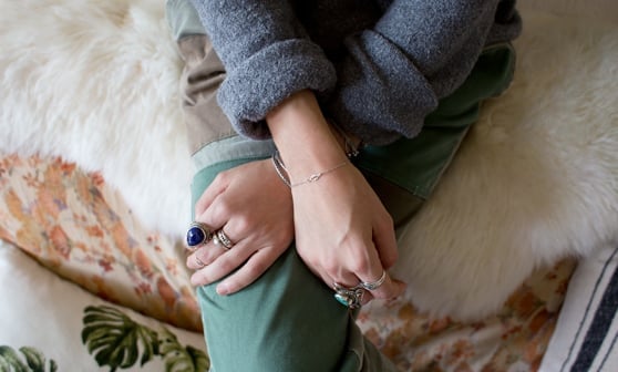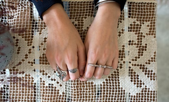Quatre petits bracelets indiens en argent usés, que je porte depuis plus de 10 ans (même sous la torture on ne me fera jamais les enlever) et une bague en argent spirale que mon père m’a offerte.