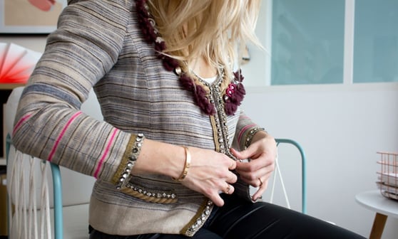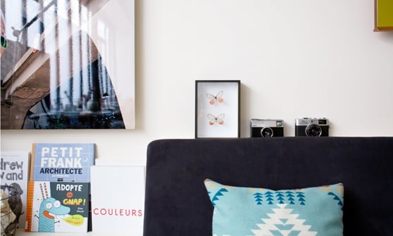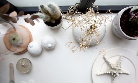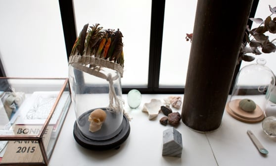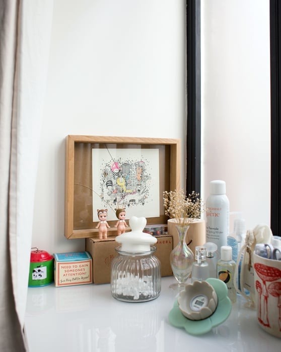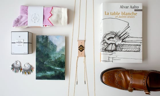 Derbies Church’s, Livre d’Alvar Aalto, Collier Fosseth, Peinture Jane W. Schmitt, Boucles d’oreilles rapportées du Laos, Parfum Beige de Chanel, Chaussettes The Athleticchez Steel Cyclewear