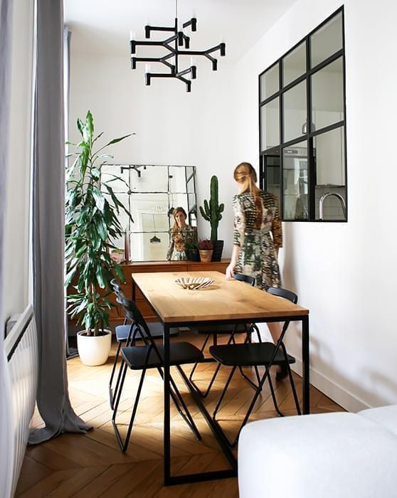 Table en chêne Bois et Fer (San Sebastian), Chaises Ikea, Suspension Crown Minor de Nemo Cassina, Enfilade + Miroir Maisons du Monde
