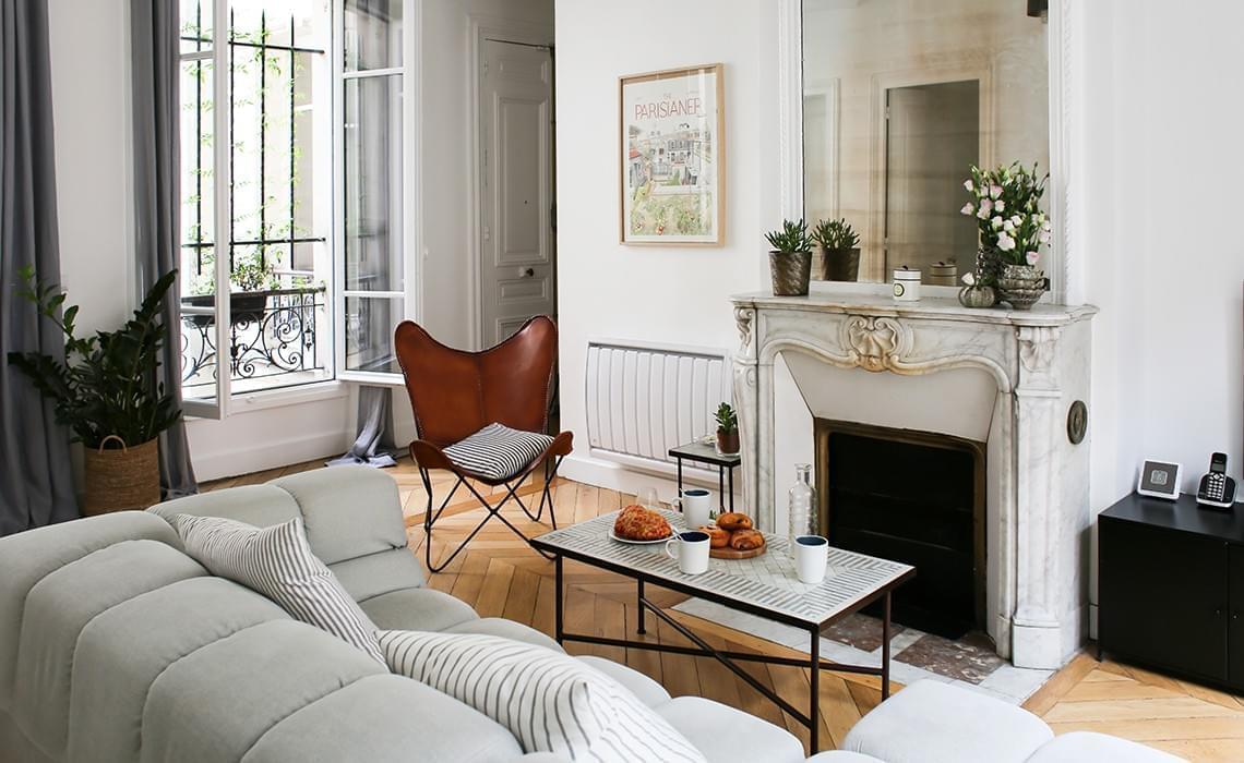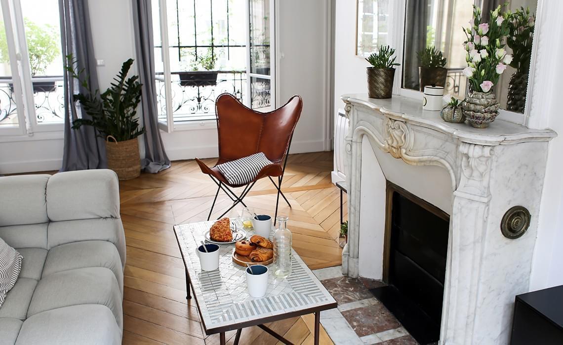 Canapé Tufty-Time de Patricia Urquiola (chez B&B Italia), Table basse marocaine, Affiche The Parisianer, Utopies par Image Republic, Vases sur la cheminée de la boutique Les mille feuilles dans le Marais, Suspension House Doctor