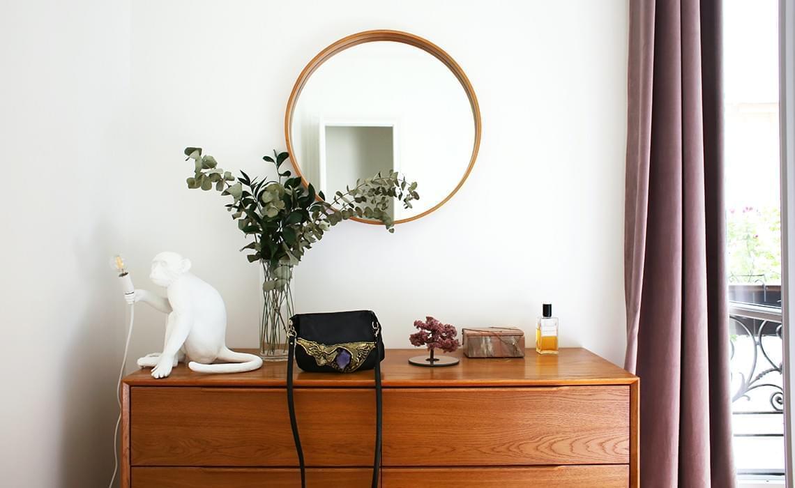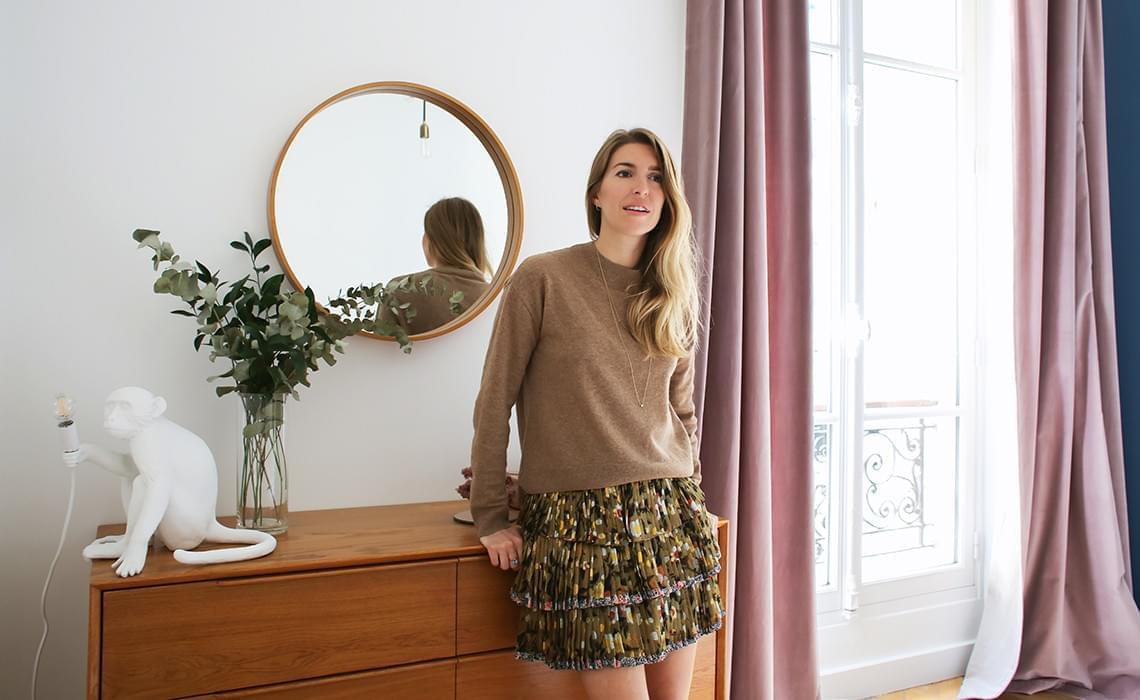 Pull &other Stories, Jupe Isabel Marant, Lampe Monkey de Seletti, Miroir La Redoute, Commode + Rideaux Maisons du monde